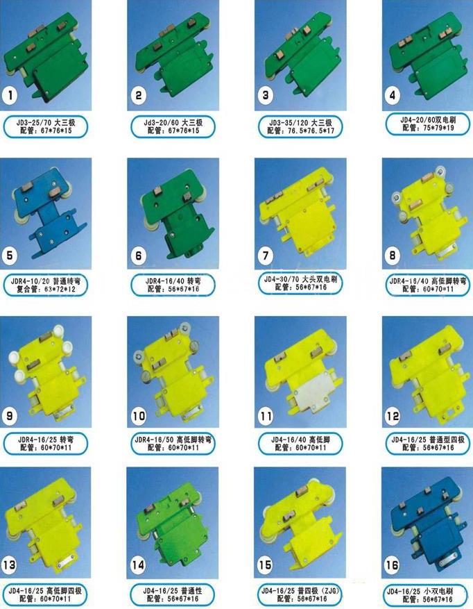 大三極、雙電刷、普通轉彎、轉彎、大頭雙電刷、高低腳轉彎、高低腳、多極集電器、多極滑觸線集電器普通型四極、高低腳四極、普通型、普四極、小雙電刷、五極、四極、雙蓋雙孔、六極轉彎、小七極管、大七極管、八極轉彎、十極管、十六極、防塵雙電刷、大四極、四線插座多極滑觸線集電器。