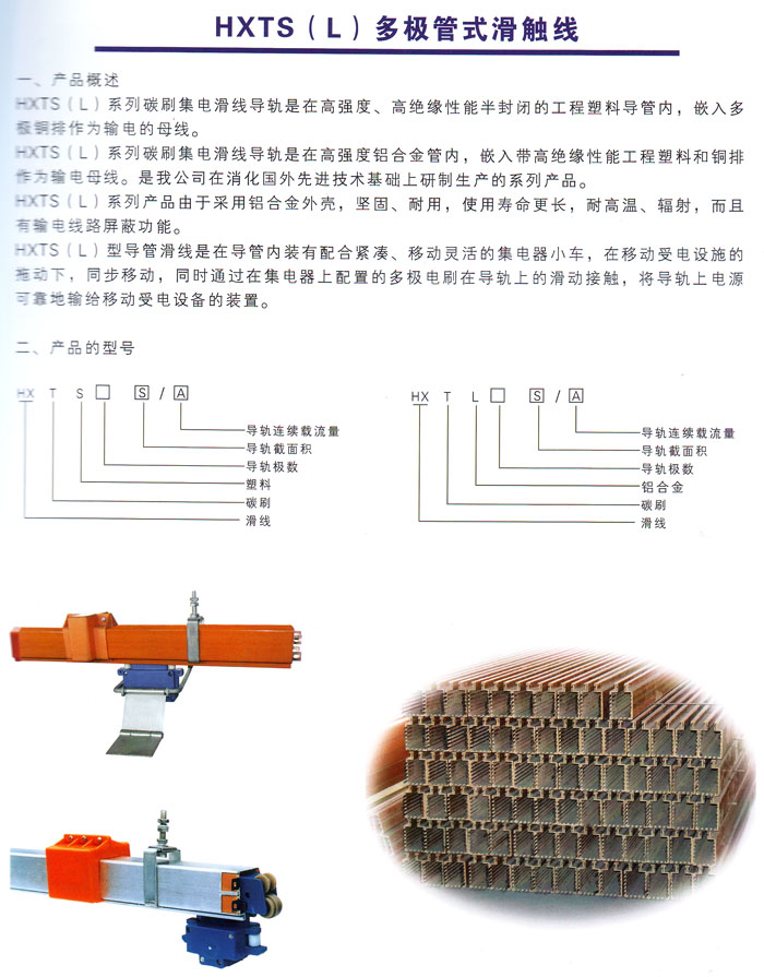 HXTS、HXTL系列多極管式滑觸線由高強度工程塑料絕緣導管或鋁合金保護殼、多級導電銅排、集電器以及懸吊、固定等組件組合而成。該產品以其設計緊湊、性能穩定、使用安全的特點被廣泛地應用于電流較小、使用頻率較高的物流自動化流水生產線以及檢測線。