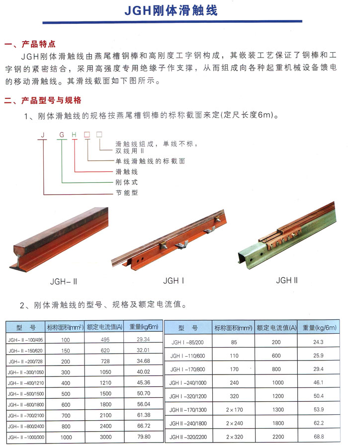JGH系列剛體滑觸線由銅導軌、導軌支架、絕緣子組件以及外置式集電器等組件組合而成。 由于該產品具有電流大、耐高溫、抗腐蝕等特點,因此被廣泛地應用于冶金、造船、港口裝卸等行業。